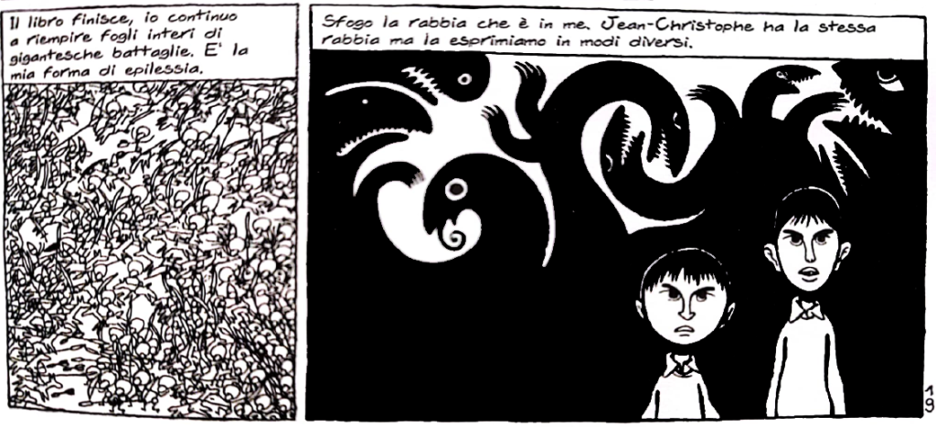 Certo, il punto di vista autobiografico non è mai stato completamente estraneo al fumetto, e già artisti del calibro di Art Spiegelman e Robert Crunch, per fare due esempi illustri presi a caso, non si erano tirati indietro quando si è trattato di “metterci la faccia”, comparendo all’interno di una propria opera. Il caso di David B. è però sostanzialmente diverso, confrontabile, almeno in Europa, forse soltanto con Persepolis, l’autobiografia disegnata di Marjane Satrapi che vedrà la luce di lì a pochissimo.