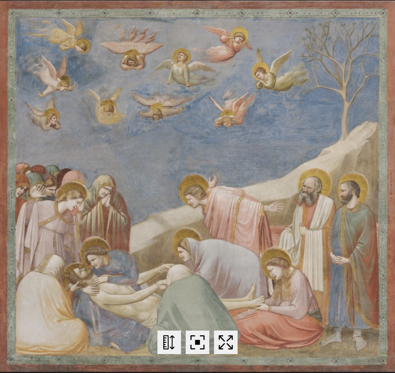 Il “Compianto del Cristo morto” rappresenta per Frugoni forse il punto più alto dell’invenzione giottesca. Nella diagonale che taglia la scena — la montagna brulla, l’albero secco, la curva del corpo della Vergine — Giotto inventa una nuova grammatica del dolore: le donne sedute a terra, le mani che stringono il corpo di Cristo, gli angeli che gridano in tutte le posture del dolore e Giovanni che si slancia in avanti con le braccia indietro traducono in gesto e colore una compassione tutta umana.