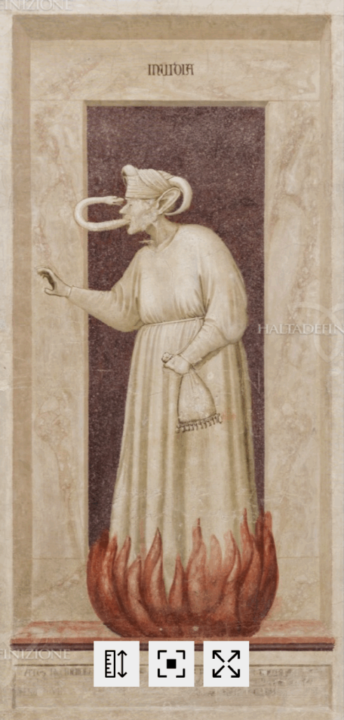 Nel registro inferiore delle “Virtù e dei Vizi”, Frugoni nota un’assenza eloquente: al posto dell’”Avarizia” compare l’”Invidia”. Non un errore, ma una scelta precisa. Enrico Scrovegni, accusato di vivere di interessi e guadagni illeciti, non vuole che il peccato dell’usura compaia fra i muri che portano il suo nome. Il ciclo parla di lui e del suo tentativo di purificare la memoria familiare.