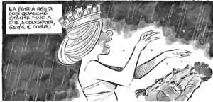 I dialoghi di un’Italia ancora pesantemente dialettale, prevalentemente veneta e contadina, meriterebbero un discorso a parte. Un’Italia idealizzata come una giovane Patria discinta, sulle copertine della “Domenica del Corriere”, ma che nel deliquio dei fantaccini si aggira di notte tra le trincee come una folle assetata di sangue per abbracciare un’ultima volta i cadaveri dei caduti e rimproverare tacitamente gli ancora viventi. Anche dal punto di vista del linguaggio e dei dialoghi per Ortolani si può parlare di una prova di maturità, perché è chiaro che Tapum gioca in un campionato diverso rispetto a strategie autoriali che, più o meno narcisisticamente, convergono sempre più spesso verso l’autonarrazione fumettistica. Per non dire di una storia che rilancia l’attualità della merdosa e dimenticata trincea, che abbiamo riscoperto a distanza di un secolo attraverso le immagini dei droni in Ucraina. E, più in generale, del carnaio verso cui la macchina del riarmo geopolitico sembra oggi nuovamente sospingere il nostro continente.