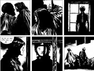 E se La Strada è un capolavoro, Il rapporto di Brodeck non è da meno. La sinergia di testo e disegni è perfetta, con quei neri pesantissimi che raccontano le persone attraverso i panneggi, la ristrettezza angusta degli spazi chiusi quei volti da contadino, scuri, con la barba spettinata e gli occhi vigili e diffidenti, volti popolani che trasmettono diffidenza, grettezza. I neri di Larcenet inghiottono la tavola così come si vorrebbero nascondere i segreti che Brodeck, poco per volta, porta alla luce. Per contrasto i suoi bianchi raccontano una natura dura e inospitale ma al tempo stesso liberatoria, perché solo quando Brodeck esce di casa a fare la legna, o per eseguire altri lavori in mezzo alla natura, riesce finalmente a stare solo, a pensare e a fuggire per un attimo dalla sua missione e da quel paesino di montagna che lo opprime.
