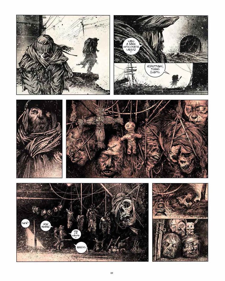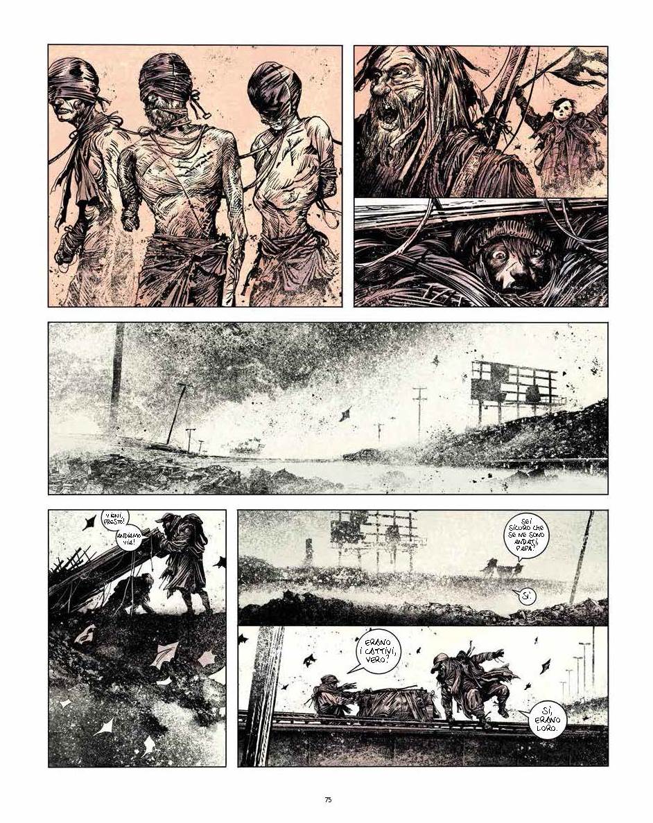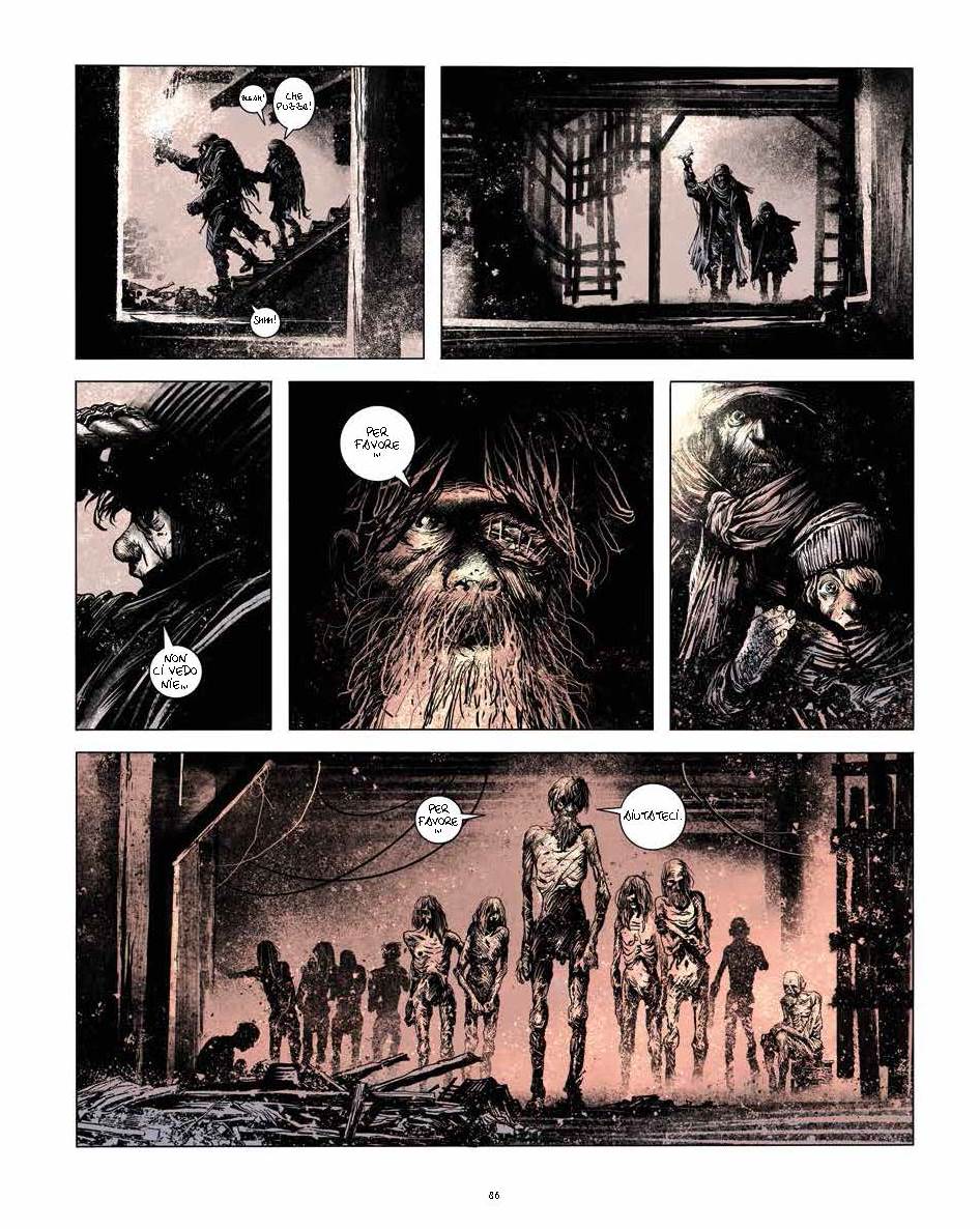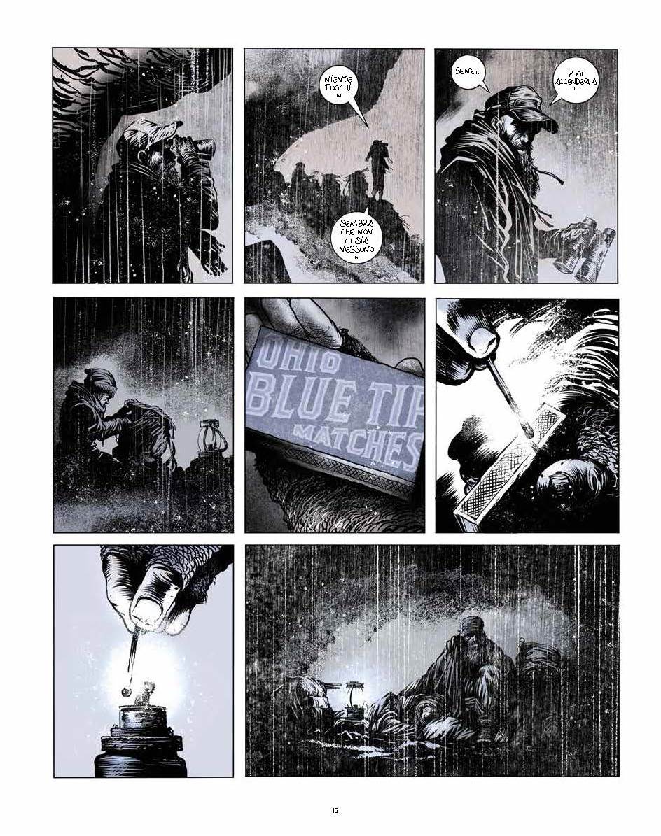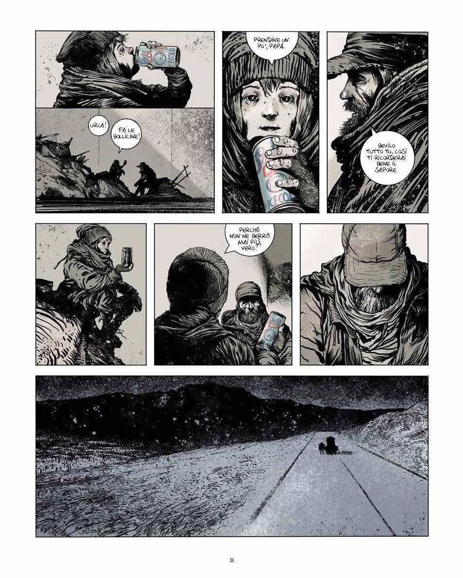 Larcenet non cede alla retorica e non fugge alla rappresentazione dell’orrore, non solo restituendo con le sue tavole i momenti più duri e raccapriccianti del romanzo, ma anche scegliendo con grande cura e coraggio le parole da far pronunciare ai due protagonisti. Per un verso, dunque, ogni vignetta è un colpo al cuore del lettore: quando restiamo sgomenti a specchiarci nello sguardo spaurito e smarrito del padre, quando guardiamo inermi il corpo rachitico del ragazzo, quando assistiamo alle pratiche più aberranti di sopravvivenza e quando ci irrigidiamo per la tensione procurata dalla pura violenza. Ma sono anche i dialoghi, sporadici ma significativi, a insinuarsi nel cuore e nella mente di chi legge, perché nella laconicità del padre è sempre possibile ravvisare l’amore e la protezione che riserva al figlio. Allo stesso modo, nella meccanicità di alcuni scambi è chiara la devozione e la fiducia che il ragazzo prova per il genitore.