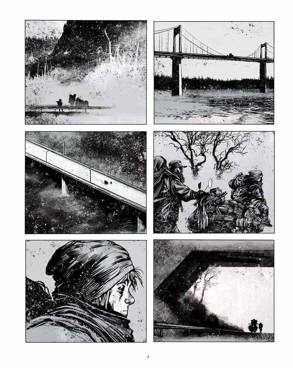 Va detto subito che, al coraggio creativo e alla responsabilità narrativa che Larcenet si è caricato in questo confronto con il romanzo, è corrisposto un graphic novel di eccezionale potenza visiva. Il capolavoro di McCarthy, pubblicato nel 2006 e premio Pulitzer nel 2007, aveva già trovato una trasposizione cinematografica nel 2009 per la regia di John Hillcoat, ma il medium del fumetto si presta ottimamente al riadattamento di questo soggetto distopico. La storia ha per protagonisti un padre e un figlio che avanzano faticosamente nel mondo post-apocalittico e completamente morto, dove il pericolo e la disumanizzazione sembrano gli unici tratti distinguibili nella costante lotta alla sopravvivenza. Allo stile secco e allo stesso tempo dettagliato che il narratore statunitense ha scelto per il suo unico romanzo fantascientifico, Larcenet imprime un segno altrettanto graffiante e complesso. In entrambe le opere non c’è filtro nella rappresentazione dell’essere umano, la distinzione fra bene e male corre sul filo della sopravvivenza, del dramma, in rari casi della speranza. Eppure una separazione fra giusto e sbagliato pare ancora possibile e sta tutta nella compassione del ragazzo, nella necessità di comprendere il prossimo, nel non arrendersi alla disillusione anche quando ogni cosa fa dubitare di un qualsiasi futuro.