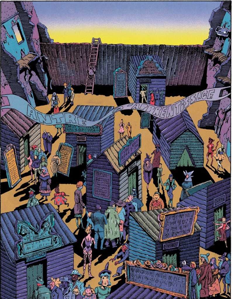 In filigrana affiora una genealogia surrealista. Le forme che si sciolgono e ricompongono altrove richiamano Jean Arp; le texture ambigue, le stratificazioni e gli scarti di superficie rimandano a Max Ernst; l’ironia feroce e la deformazione morbida dialogano con Roland Topor allora figura imprescindibile in Francia. Non si tratta di citazioni, ma di un clima: una postura visiva che tratta la pagina come luogo di instabilità. Lo spazio di Métal Hurlant, dominato dalla star e matita di punta Moebius – autore che per molti versi prosegue, in chiave contemporanea, la tradizione delle forme biomorfiche e dell’automatismo surrealista – era un ambiente visivo fortissimo, ma anche un contesto in cui la voce di Claveloux riuscì a mantenere una piena autonomia poetica.