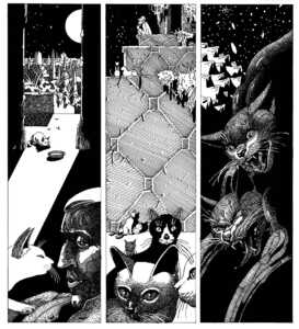 Accanto al racconto a colori, il volume presenta un nucleo di storie in bianco e nero che rivelano un registro diverso, fondato sull’incisione del segno. Qui la trasformazione passa attraverso il tratteggio, le ombre fitte, le prospettive che scivolano. Le architetture sembrano respirare, i volti si deformano, nel numero speciale dedicato dalla rivista a H.P. Lovecraft i gatti riempiono la scena come presenze enigmatiche. L’immaginazione non si espande come nel colore: si addensa. Le superfici inchiostrate pulsano di dettagli barocchi e suggeriscono mondi interi attraverso minime variazioni.