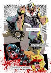 Detto questo, inizia la parte interessante. Harsh Comics 90’s. Pentacle, come dice il titolo, propone un salto all’indietro nel tempo e un tuffo nell’universo super superomistico dei primi anni ‘90. Stando alle note dall’autore, l’idea (poi abbandonata) prevedeva anche di riesumare l’immaginario muscolare e ipertrofico della (allora) neonata Image Comics e del suo profeta, l’asso del culturismo grafico Rob Liefeld. Alla fine l’album attinge al frammentato e destrutturato mondo fumettistico di quel periodo, sorto dalle rovine ancora fumanti che storie come Watchmen di Alan Moore o il Batman di Frank Miller, Stray Toasters di Sienkiewicz o Marshall Law di Pat Mills e Kevin O’Neill si erano lasciati alle spalle dopo aver fatto il loro sporco lavoro. Il segno di una stagione di revisionismo etico ed estetico arrivata ai nostri giorni, via Garth Ennis e gli sfacciati anni duemila, con il cinismo edgy di una serie come The Boys. Ma questa è un’altra storia.