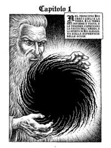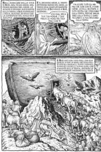 Sul piano grafico, Crumb mette in campo uno stile riconoscibile e coerente con questa impostazione: un bianco e nero denso, costruito attraverso un tratteggio ossessivo che restituisce peso, volume e concretezza ai corpi e agli ambienti. I personaggi della Genesi non sono figure simboliche o idealizzate, ma uomini e donne massicci, spesso goffi, radicati in una fisicità quasi brutale. La linea, nervosa e stratificata, insiste sui dettagli (barbe, pieghe della pelle, tessuti, architetture) contribuendo a creare un effetto di realismo “sporco” che per certi versi può anche allontanare l’aura sacrale. Anche la composizione delle tavole, regolare e scandita, accompagna il ritmo del testo biblico senza spettacolarizzarlo, trasformando la lettura in un’esperienza lenta, quasi liturgica, ma attraversata da una tensione costante tra la monumentalità del racconto e la crudezza della sua rappresentazione.